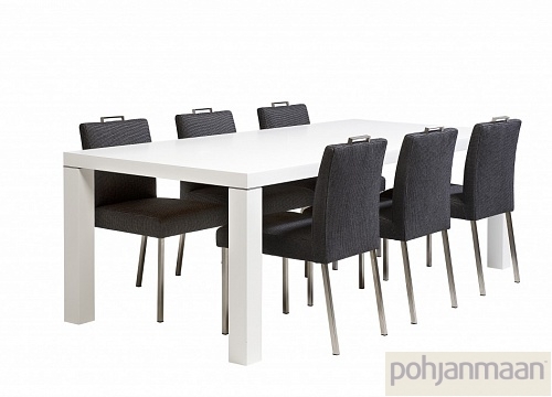 Pohjanmaan (мягкая мебель из Финляндии) / Каталог / Обеденные зоны / Белый стол с черными стульями «Line»